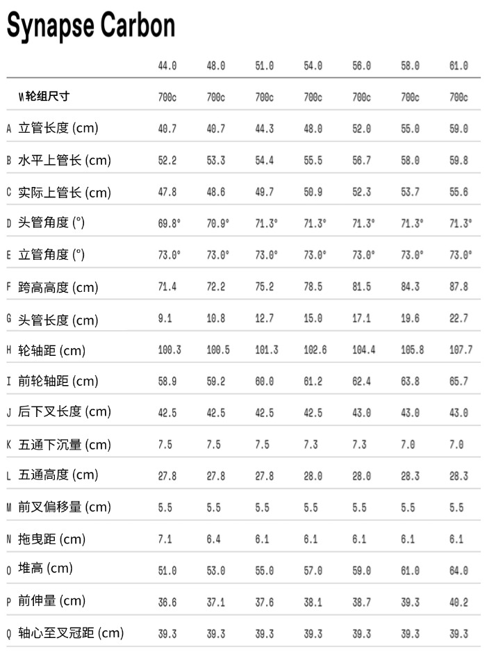 • 车架 Synapse 碳纤维材质,配备SmartSense智能系统,采用Proportional Response尺寸专属设计,BSA螺纹中轴,平装式刹车,12×142毫米贯穿轴,带Switch Plate的贯穿式内走线,可拆卸挡泥板桥,隐藏式货架/挡泥板安装孔