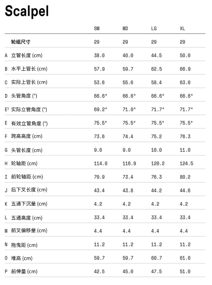 • 车架 Scalpel,轻量化碳纤维结构,120毫米行程,比例响应悬挂系统与几何结构,FlexPivot后叉,全内走线,73毫米BSA中轴,带1-1/8英寸上部减速器/内部导线导向件的1.5英寸头管,148×12毫米贯通轴,55毫米链条线,UDH通用后拨挂钩,柱装式碟刹,原生适配160毫米刹车盘
